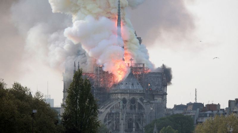 Според френски медии и някои световни агенции е рухнала островърхата кула на Нотр Дам. Според други източници е рухнала част от кулата. Противоречиви са и информациите за състоянието на покрива, дали е рухнал напълно или частично и до каква степен е засегната и долната част на храма. Телевизионни кадри показват пламъците да напредват надолу в храма.