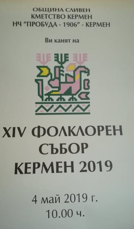 Община Сливен, кметството в град Кермен и НЧ „Пробуда 1906” организират XIV Фолклорен събор „Кермен 2019“. Той ще започне на 4 май от 10.00 часа в град Кермен.