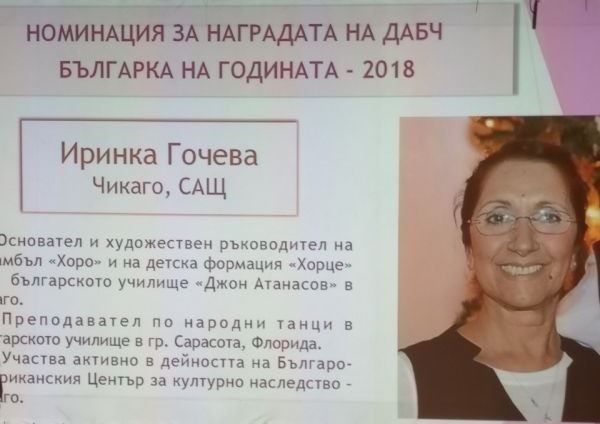 Кметът Стефан Радев поздрави Иринка Гочева за приза на Държавната агенция за българите в чужбина „Българка на годината – 2018“. Гочева, която от години живее в Чикаго, е основател и художествен ръководител на ансамбъл „Хоро“ и детска формация „Хорце“ към българското училище „Джон Атанасов“ в американския град. Преди това, в продължение на 25 години, Иринка Гочева е била танцьорка в Ансамбъла за народни песни и танци-Сливен. Нейни бивши колеги присъстваха на награждаването и предадоха поздравителен адрес и цветя от кмета Стефан Радев. Той отправи своите поздравления за наградата и благодари, че със своята дейност Иринка Гочева прославя България и зад Океана.