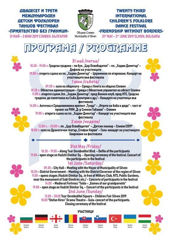 Днес в Сливен започва ХХIII Международен фестивал „Приятелство без граници“, който ще продължи до 2 юни. В града пристигат деца от Германия, Грузия, Румъния, Словакия, Словения, Турция, Украйна и Унгария, които заедно с фолклорните състави от Сливен, ще изградят една пъстра и цветна история на приятелството.