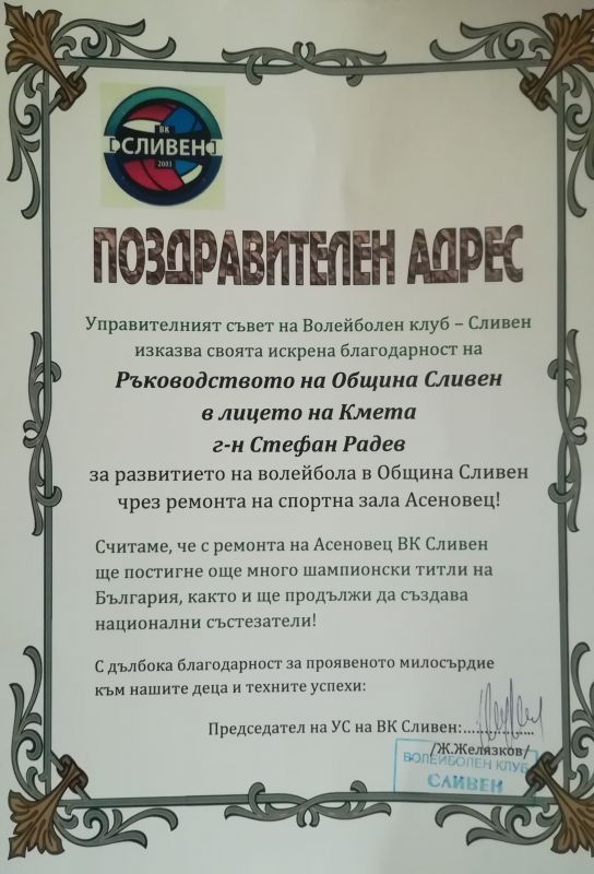 ВОЛЕЙБОЛЕН КЛУБ - СЛИВЕН С БЛАГОДАРСТВЕНО ПИСМО ДО КМЕТА СТЕФАН РАДЕВ