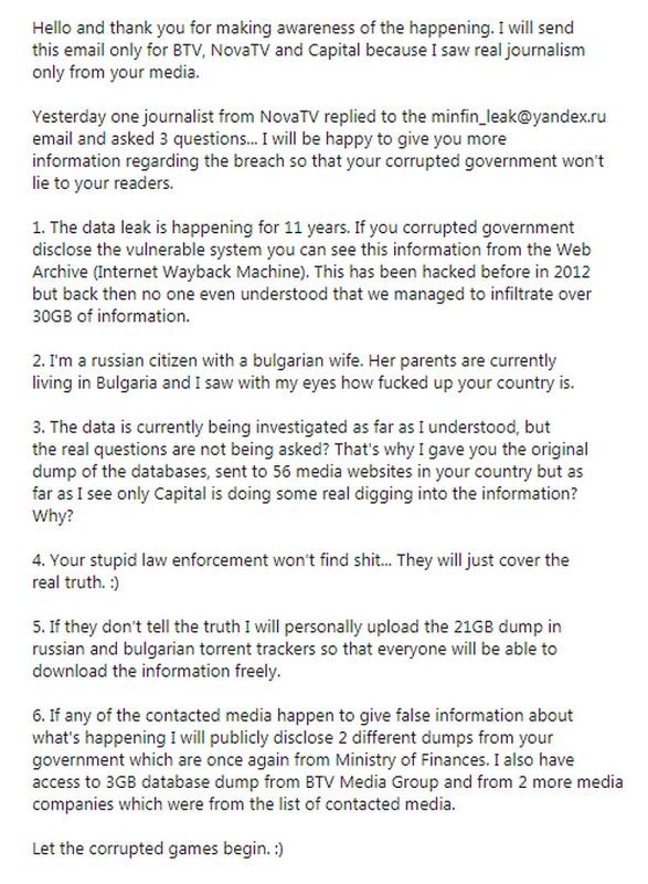 „Глупавите ви правораздавателни органи няма да открият нищо. Просто ще прикрият истината. Ако това се случи, аз лично ще кача информацията в руски и български торент тракери, така че всеки ще може да я свали свободно. Ако медиите, с които влизам в контакт, публикуват невярна информация, ще разкрия още две порции данни – отново от Министерството на финансите”, се казва още в електронното писмо.