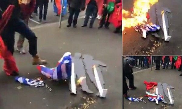 Демонстрантите запалиха българско, гръцко и албанско знаме и картонени фигури на премиера на Северна Македония Зоран Заев и вицепремиера Радмила Шекеринска.