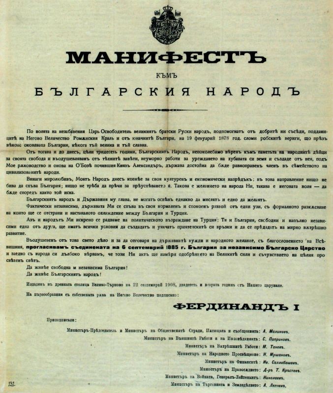 22 септември 1908 година е денят, в който княз Фердинанд, управляващ дотогава васалното на Османската империя Княжество България, прочита подписания от него и от правителството на Александър Малинов манифест. Това става в църквата „Св. Четиридесет мъченици“ във Велико Търново.