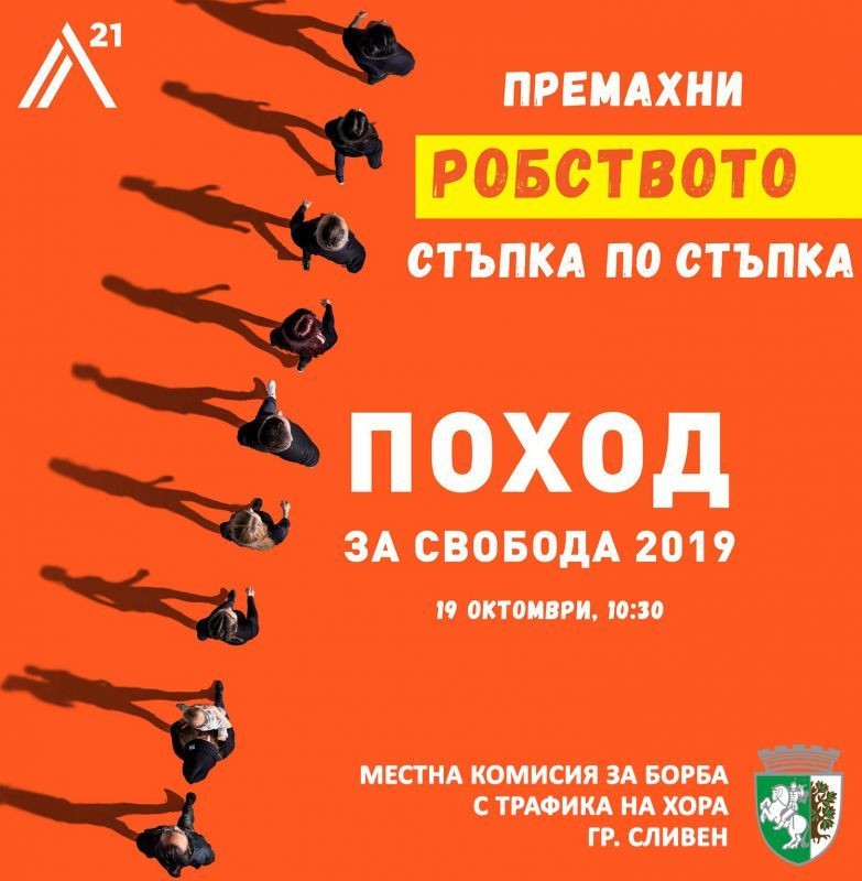 На 19-и октомври за поредна година Фондация “А21 България” в партньорство с Националната комисия за борба с трафика на хора и Местната комисия за борба с трафика на хора, гр. Сливен, организират най-мащабната информационна кампания против трафика на хора ПОХОД за СВОБОДА, уникално по рода си глобално събитие, което се провежда ежегодно в повече от 450 града в над 50 държави по цял свят и с това се превръща в най-голямата и значима инициатива в подкрепа на жертвите на трафик на хора в света.