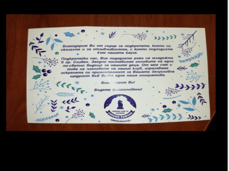 БЛАГОДАРСТВЕН АДРЕС ДО КМЕТА СТЕФАН РАДЕВ ОТ КЛУБА ПО ШАХ ЗА ДЕЦА „СИНИТЕ КАМЪНИ“