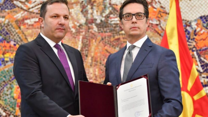 Президентът на Северна Македония Стево Пендаровски (вдясно) връчва мандат за сформиране на служебно правителство на Оливер Спасовски.