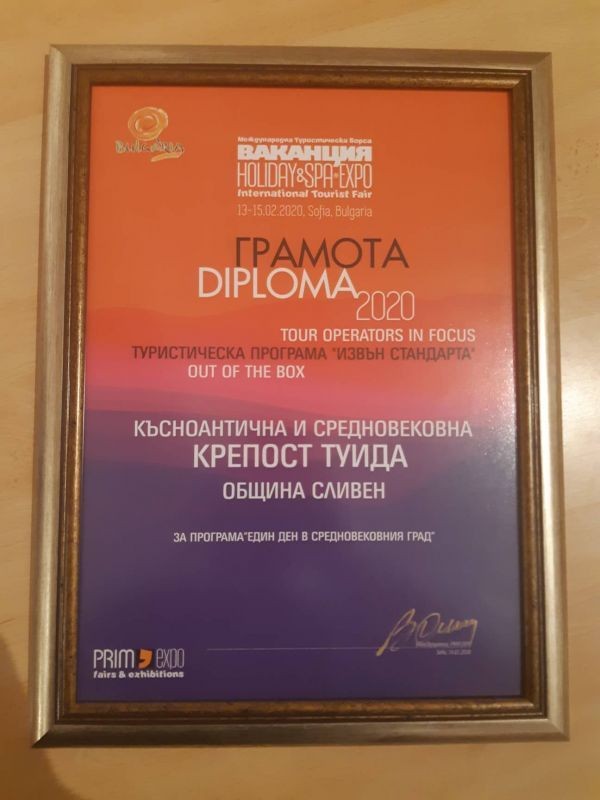 Късноантична и средновековна крепост Туида спечели безапелационно в Годишните награди на „Ваканция и СПА Експо-2020”. Сливенският обект бе отличен след оценка на експертно жури в категория "Извън стандарта". Призът е връчен за Програмата „Един ден в Средновековния град”, която се предлага в Крепост Туида от 2019 г.