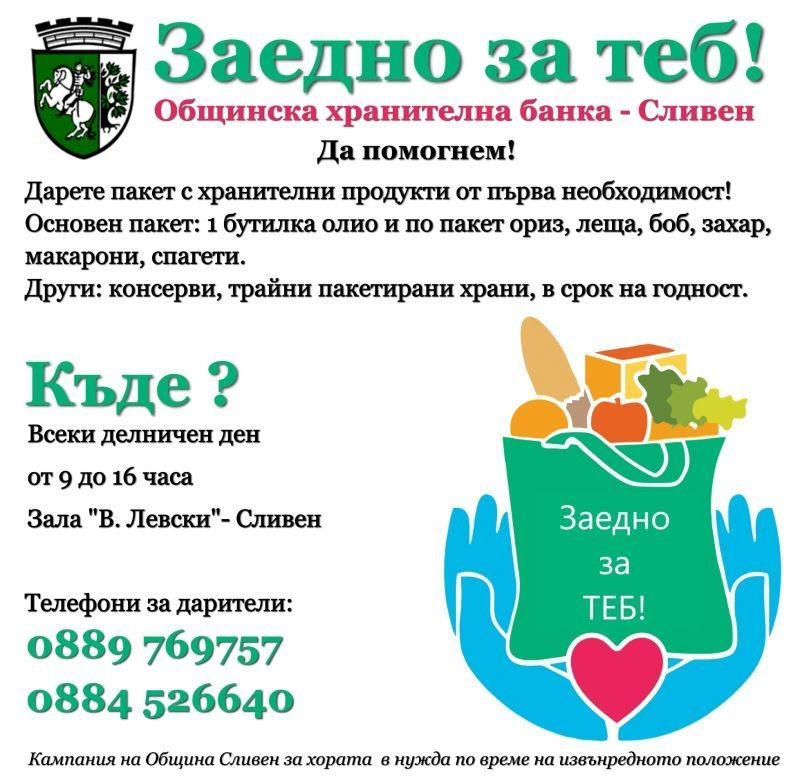 Кампанията „Заедно за теб!“, чрез създаването на Общинска хранителна банка, организирана от Сливенска община, е по инициатива на кмета Стефан Радев. Тя е част от мерките в помощ на хората в тежко социално положение заради извънредната ситуация.