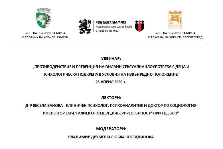 В изпълнение на Националната стратегия за борба с трафика на хора 2017-2021 г. и адаптиране на Програмите за предотвратяване и противодействие на трафика на хора и закрила на жертвите за 2020 г. спрямо извънредното положение в страната, на 28 април 2020 г., секретарите на Местните комисии за борба с трафика на хора (МКБТХ) в гр. Сливен и в гр. Благоевград ще проведат в партньорство регионален уебинар на тема „Противодействие и превенция на онлайн сексуална злоупотреба с деца и психологическа подкрепа в условия на извънредно положение”. Лектори ще бъдат д-р Весела Банова – клиничен психолог, психоаналитик и доктор по социология и инспектор Емил Илиев от отдел „Киберпрестъпност” при Главна дирекция „Борба с организираната престъпност”.