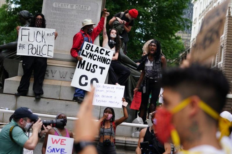 В Атланта събрали се пред централата на Си Ен Ен надраскаха с графити огромните червени букви от логото, счупиха прозорци и хвърляха камъни.Полицейското присъствие там е засилено.