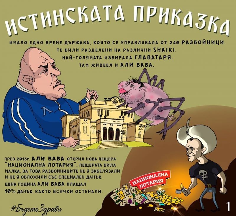 Имало едно време държава, която се управлявала от 240-те разбойници. Те били разделени на различни shaiki, а най-голямата избирала Главатаря. Там живеел и Али-Баба. През 2013 г. той открил нова пещера – „Национална лотария“. Пещерата била малка и затова разбойниците не я забелязали и не я обложили със специален данък. Една година Али Баба плащал 10% данък, като всички останали", започва историята. На картинката са нарисувани премиерът Бойко Борисов, а депутатът Делян Пеевски е изобразен като паяк. Али Баба е самият Васил Божков, нагласен с чалма и тениска с череп.