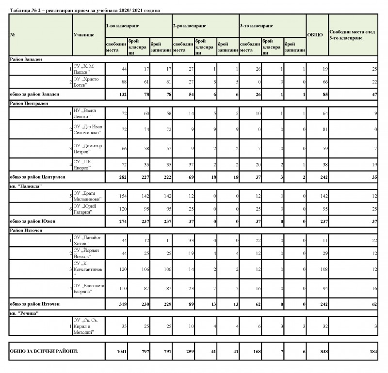 Най-много свободни места има в СУ „Х.М. Пашов“ и ОУ „Юрий Гагарин“ – по 25. Преди тях са СУ „П.Яворов“ с 19, а ОУ „Христо Ботев“ и ОУ „П.Хитов“ – с по 22, ОУ „Елисавета Багряна – 16, ОУ „Братя Миладинови“, СУ „Йордан Йовков“ е СУ „Константин Константинов“ – с по 12.