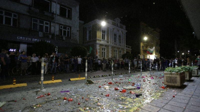 Стигна се до кратко напрежение, след като един от протестиращите хвърли димки към сградата.