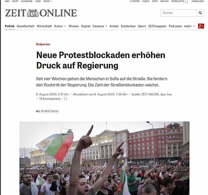 „Демонстрантите в България засилиха натиска върху управляващите с нови протести и по-голяма палаткова блокада. Хвърляха домати и яйца по сградата на Министерския съвет в столицата. Блокираха отново три ключови кръстовища, за да постигнат исканията си – оставка на управляващите, на главния прокурор и нови избори.