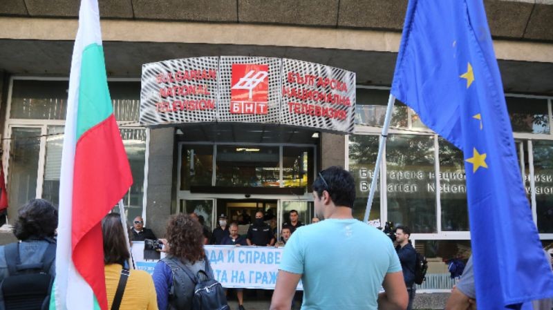 Централният вход на Националната телевизия беше блокиран от протестиращи, които не допускаха гостите на телевизията да влизат в сградата.