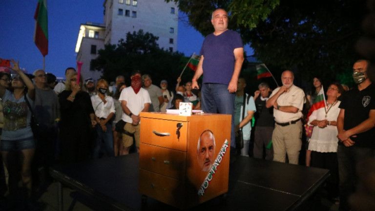 "Времето му изтича", каза от сцената представителят на Отровното трио Арман Бабикян. Върху шкафчето имаше химикалки и бели листове, на които хората да напишат мотивите си за оставка на кабинета.