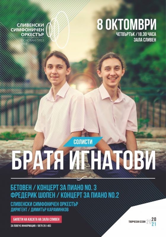 Концерт за пиано и оркестър No.3 на Бетховен и Концерт за пиано и оркестър No.2 на Фредерик Шопен ще представи за своите почитатели Сливенският симфоничен оркестър. Гост-солисти на вечерта ще бъдат пианистите и носители на десетки награди от различни конкурси братята Хасан и Ибрахим Игнатови.