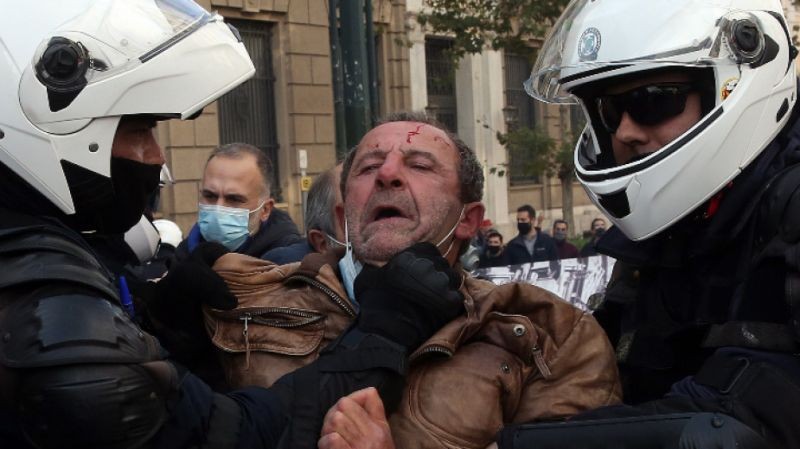 Служители на полицията арестуват участник в демонстрация, организираната по повод на бунтовете от 1973 г. срещу военната хунта - Атина, 17 ноември 2020 г.