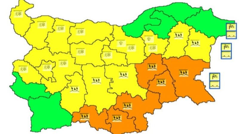 В останалата част от страната, с изключение на областите Благоевград, Кюстендил, Русе, Разград, Силистра и Добрич, е в сила жълт код за сняг и дъжд.