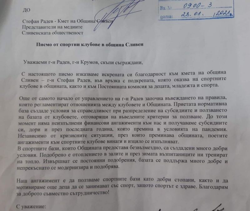 Благодарност за доброто съвместно сътрудничество изразиха в писмо до кмета Стефан Радев над 20 спортни клуба от община Сливен. Те изказват и признателността си към него във връзка с подкрепата, която получават, както и към Постоянната комисия за децата, младежта и спорта.