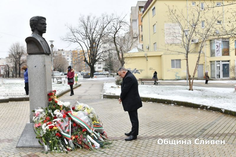 Цветя пред паметника на Васил Левски на площада, носещ неговото име поднесоха кметът Стефан Радев, председателят на Общински съвет-Сливен Димитър Митев и зам.-областният управител Камен Костов.