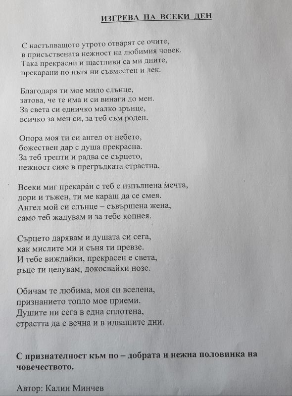 Инженер Калин Минчев от Дирекция „Общинска инфраструктура“ в Община Сливен за поредна година посвети свое стихотворение на представителите на нежния пол по случай Международния ден на жената – 8 март, който отбелязваме днес. То е озаглавено „Изгрева на всеки ден“ и е „С признателност към по-добрата и нежна половинка на човечеството“, според автора.