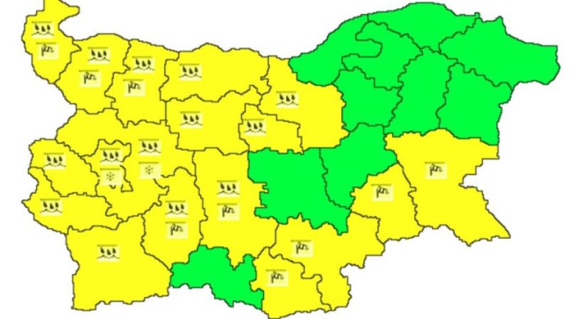 Това сочи справка в сайта на Националния институт по метеорология и хидрология (НИМХ). Жълтият код означава, че времето е потенциално опасно. Предупреждението за обилни валежи важи за София-град и областите София, Видин, Монтана, Враца, Ловеч, Плевен, Габрово, Велико Търново, Перник, Кюстендил, Пазарджик, Пловдив и Благоевград.