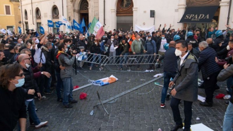 В редица италиански градове се провеждат протести на представители на различни търговски дейности, затворени заради пандемията. В столицата Рим се стигна до сблъсъци.