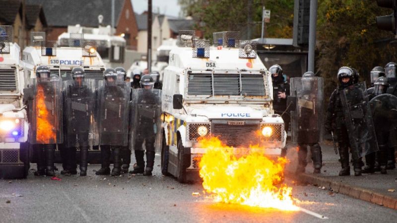 Северноирландската полиция твърди, че подобно насилие не е наблюдавано в провинцията от години. Тълпите вече се опитват да се сражават от двете страни по границата между квартали, населени с католици и протестанти в Западен Белфаст и полицията понася последствията в опит да ги разделя.