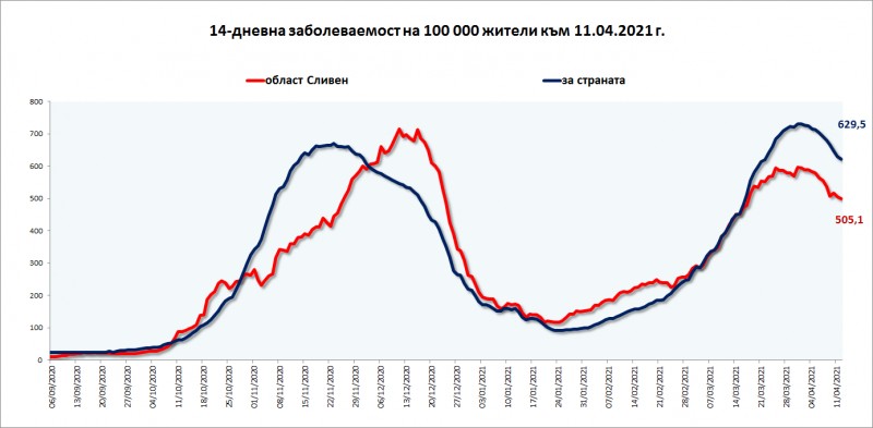 Заболеваемостта в област Сливен остава под средната за страната, съобщиха от Областния кризисен щаб. Към момента тя е 505,1 при 629,5 души на 100 000 души население. През изминалата седмица са заболели 383 души. В сравнение с предходния едноседмичен период те са с близо 29 процента по-малко. Сред новодиагностицираните лица са санитарка, медицинска сестра, акушерка, шофьор на линейка.
