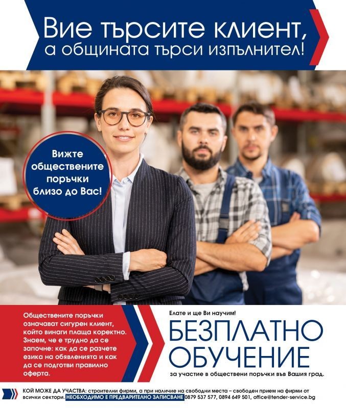 На 30-и юни и 1-ви юли 2021 в град Сливен, ще се проведе безплатно обучение за строителни фирми, които имат желание да участват в обществени поръчки, но им липсват знания и опит в тази сфера. В обучението ще бъдат представени строителните поръчки, възлагани от Община Сливен в последните 2 години, както и планираните за 2021 строителни дейности, които предстои да бъдат отворени скоро, така че желаещите фирми да имат достатъчно време да се подготвят за тях. В практическата част ще бъде демонстрирана стъпка по стъпка работата с ЦАИС-ЕОП и как на практика участниците могат да подадат офертното си предложение през нея. Експерт-юрист по ЗОП ще обърне внимание на важни теми относно правилната подготовка и най-често срещани проблеми при кандидатстване в обществени поръчки.