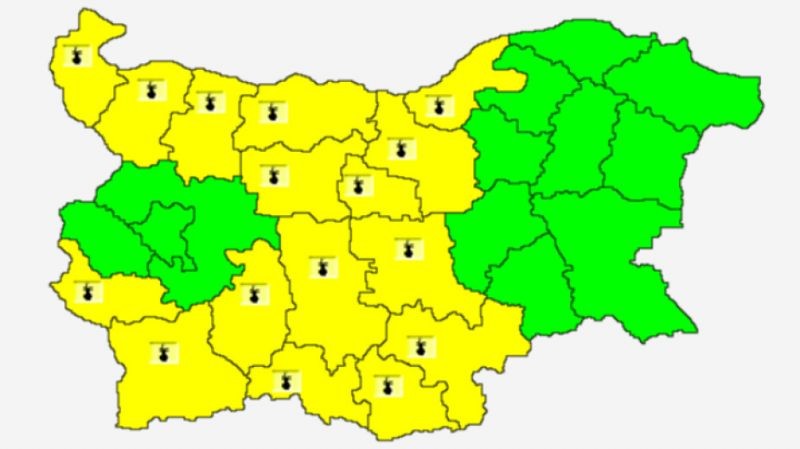 Предупреждението е в сила в почти всички райони на Централна и Западна България - без областите Софийска и Пернишка.