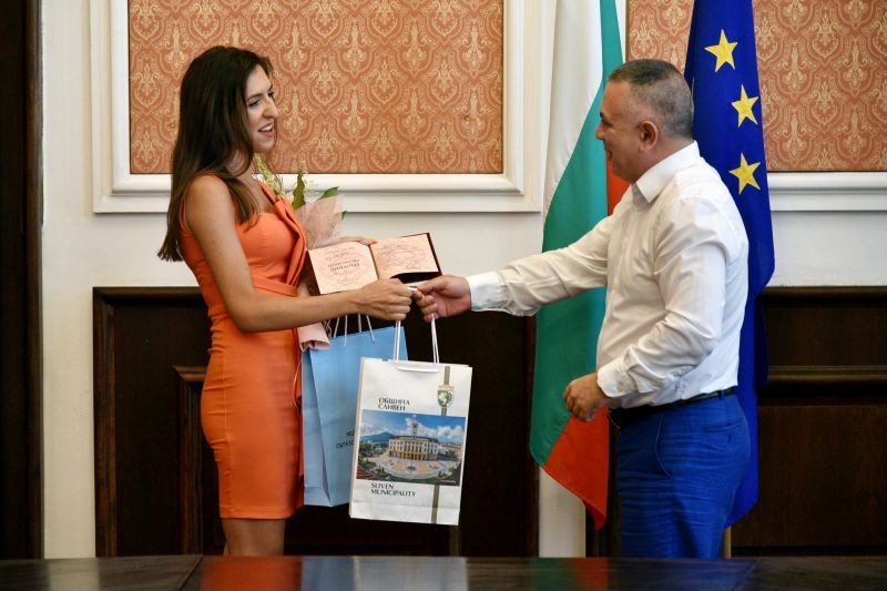 Кметът Стефан Радев днес се срещна с Ванина Стойчева, завършила с пълен отличен успех средното си образование. Възпитаничката на ППМГ „Добри Чинтулов“ е сред 29-те зрелостници от цялата страна, отличени с Национална диплома за отличен успех от Министерството на образованието и науката. Днес дипломата й връчи началникът на Регионалното управление на образованието Милена Чолакова. Кметът подари на Ванина „Енциклопедия България“, издание на Българската академия на науките, цветен албум на Сливен и сувенир от родния град.