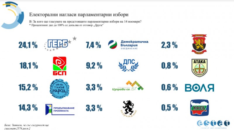 Две седмици преди вота 24,1 % от избирателите биха гласували за ГЕРБ на предстоящите избори. На второ място е БСП с 18,1 %, следвана от „Има такъв народ”, която получава 15,2 % от гласовете. Четвърти остават „Продължаваме промяната”, вземайки 14,3 %. ДПС получава 9,2 % от гласовете, а „Демократична България” - 7,4 %.