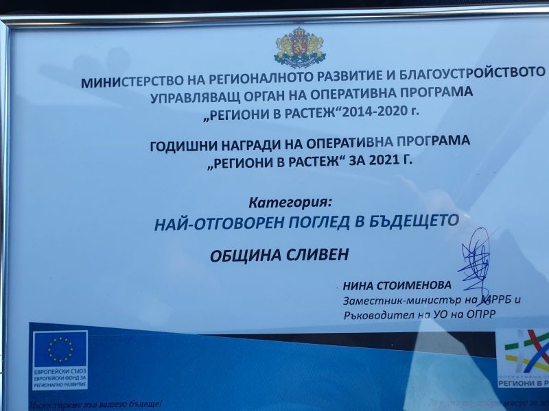 Община Сливен бе отличена с награда в категорията „Най-отговорен поглед в бъдещето“ от Управляващия орган (УО) на Оперативна програма „Региони в растеж“ за 2021 г. Престижната награда връчи зам.-министърът на регионалното развитие и благоустройството Нина Стоименова на годишното информационно събитие на оперативната програма, състояло се в Бургас.