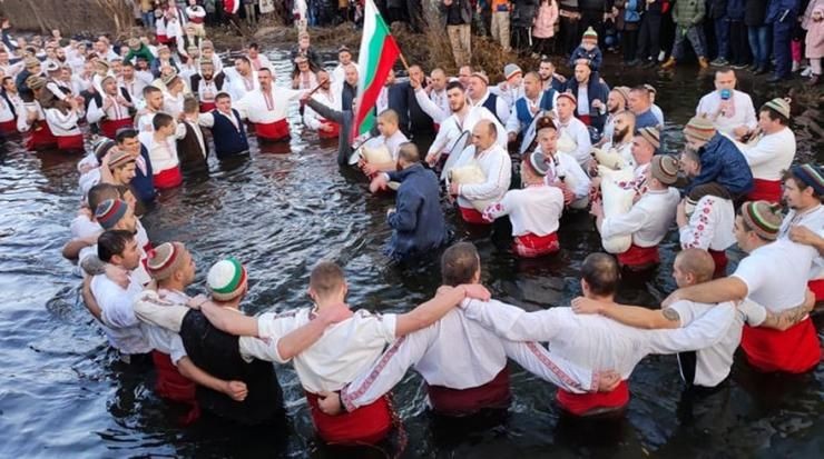 Малко преди 08:00 ч. мъже от всички възрасти и една жена, облечени в носии и със знамена, нагазиха студените води на река Тунджа в Калофер, за да направят традиционното за Богоявление мъжко хоро.
