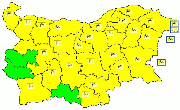 Жълт код за силен вятър, е обявен в по-голямата част на страната. Предупреждението е в сила за 24 области, с изключение на София град, Перник, Кюстендил и Смолян.