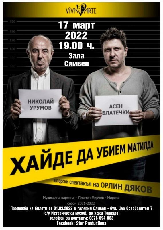Авторски спектакъл на Орлин Дяков, носещо заглавието „Хайде да убием Матилда“, ще бъде представен в зала „Сливен“ на 17 март. Началото е 19 часа.