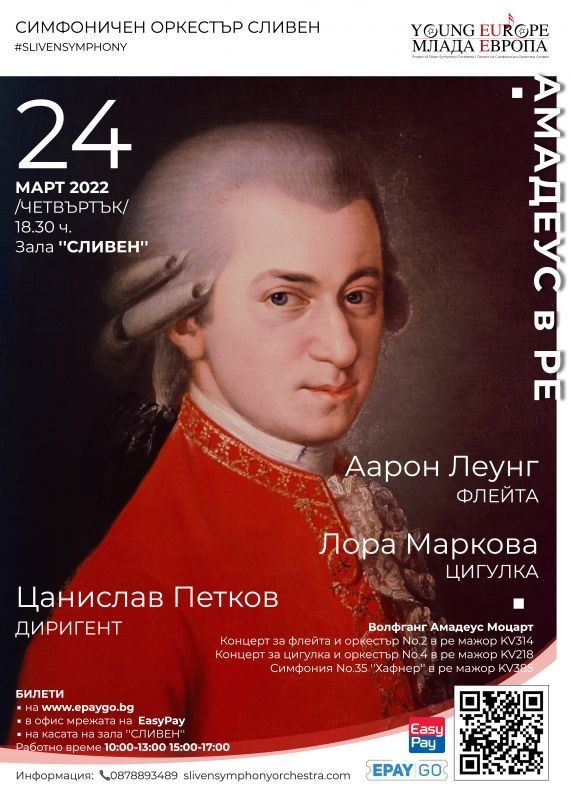В четвъртък 24 март, от 18.30 ч. в зала „Сливен”, публиката ще има възможност да чуе една завладяваща програма, изцяло с композиции на великия Волфганг Амадеус Моцарт. Концертът е под надслов “АМАДЕУС в РЕ” и включва три емблематични творения на безсмъртния гений, Симфония No.35 “Хафнер”, Концерт за флейта No.2 и Концерт за цигулка No.4, всички в неслучайно подбраната тоналност Ре мажор. Това е тоналността на триумфа, радостта и оптимизма. Тържествените симфонии, маршовете, празничните песни и небесните хорове са поставени в тази тоналност.