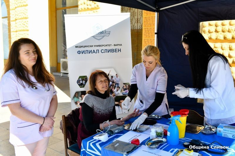 Измерване на кръвно налягане, сатурация, кръвна захар и други показатели ще се извършва на 6, 7 и 8 април пред сградата на Общината в Сливен. Инициативата е на Медицинския филиал в града по повод 7 април – Световен ден на здравето и Ден на здравния работник. Студенти ще извършват измерванията от 10 до 16 часа през трите дни. Община Сливен се включва в проявата с информация за здравословното хранене и предоставяне на плод за всеки, който си направи изследвания.