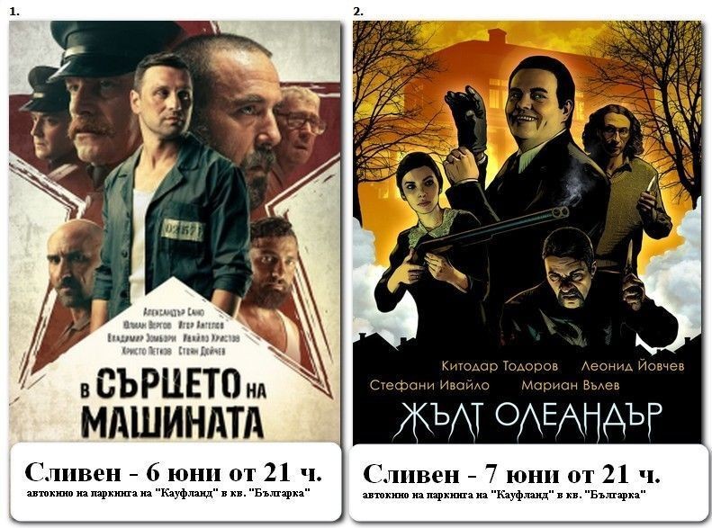 Община Сливен кани жителите и гости на града на безплатно автокино две поредни вечери. Партньор в инициативата е „Силвърнойз Фрейм“. Филмите са - „В сърцето на машината“, който ще бъде излъчен тази вечер, а вторият - „Жълт олеандър“, утре, 7 юни. И в двете вечери филмите започват в 21 ч. на паркинга на магазин „Кауфланд“ на бул. „Георги Данчев“. За по-ефективното подреждане на колите и осигуряване на възможност повече хора да могат да гледат филмите, организаторите отправят молба автомобилите да започнат да пристигат на паркинга след 19.30 ч.