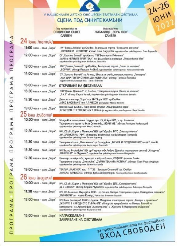 И тази година Сливен се превръща в притегателна точка за млади театрали от цялата страна. Поводът е петото поредно издание на Националния детско – юношески театрален фестивал „Сцена под Сините камъни”. Той започва на 24 юни, като официалното откриване ще се състои от 16 ч. в зала „Зора“.