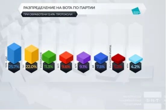 ЦИК при обработени 24,29%: ГЕРБ - 25.36%, ПП - 21.61%, Възраждане - 11,06%, ДПС - 10.09%, БСП - 9.66%, ДБ - 7.31%, "Български възход" - 5.19%, ИТН - 4.20%.
