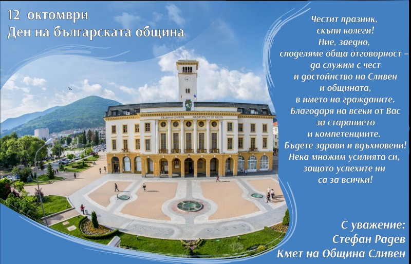 В Деня на българската община и местното самоуправление, който се чества на 12 октомври, кметът Стефан Радев поздравява всички свои колеги от Общинска администрация, кметове на населени места и кметски наместници.