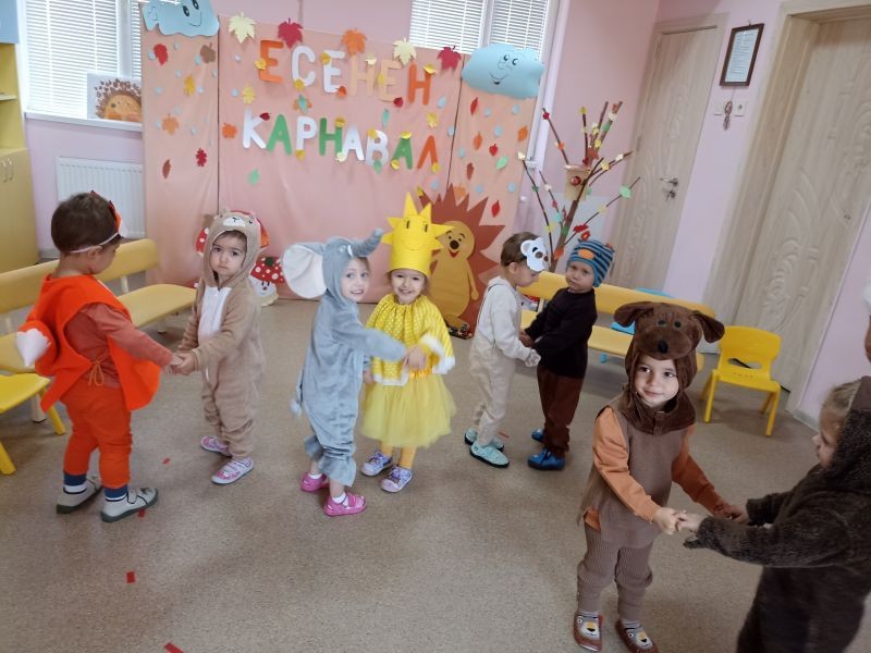 Провеждането на Есенен карнавал е традиция в детската ясла и е винаги съпроводен с много забавления, музика, песни и танци за децата. Родителите подготвиха костюми на животни, с които малчуганите дефилираха поотделно във всяка група. На пъстро украсена сцена, те показаха своите знания и умения с изпълнението на песни, танци и подвижни игри. Инициативата е част от идеите, които разработва екипът за създаване на приятна и спокойна обстановка по време на престой на децата в яслата. Целта е те да се включват в забавни и образователни игри, бърза и лесна адаптация.