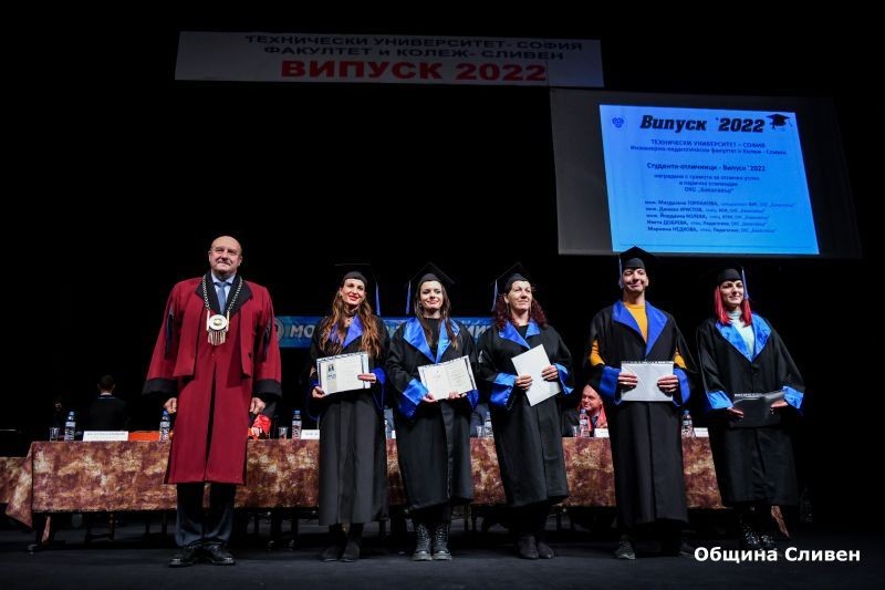 Четиристотин шейсет и седем абсолвенти от випуск`2022 на Инженерно-педагогически факултет и Колеж – Сливен към Софийски Технически университет получиха днес на тържествена церемония своите дипломи. Събитието се проведе в залата на Драматичен театър „Стефан Киров“ и събра на едно място ръководството на висшето техническо училище, представители на академичния състав, на бизнеса, директори и представители на институции в града, студенти, международни партньори, общественици и граждани. Сред присъстващите бе зам.кметът Румен Иванов, който връчи поздравителен адрес от името на кмета Стефан Радев. В него градоначалникът поздравява всички студенти, завършили успешно обучението си. Той им пожелава още да бъдат вдъхновени, мъдро да отстояват принципите си и да вярват, че най-доброто за тях тепърва предстои. „Този празничен миг е наградата за вашето усилено обучение, усърдна подготовка и несломима воля да се усъвършенствате и ознаменува избора на верния път за бъдещата ви реализация“, пише още в поздравленията от кмета Радев. В тях той използва случая да поздрави също зам.-ректора на „Факултет и Колеж-Сливен“ проф. д.т.н. инж. Станимир Карапетков за дългогодишните усилия и енергия в развитието на основните звена на ТУ-София в Сливен. „През годините Вие успяхте да наложите и да откроите доброто име на Инженерно-педагогически факултет и Колеж – Сливен към Софийския Технически университет, превръщайки го в конкурентно и висококвалифицирано висше учебно заведение. На Вас и целия академичен състав пожелавам здраве, енергия, успехи и още много абсолвенти! На добър час!“, завършва Стефан Радев.