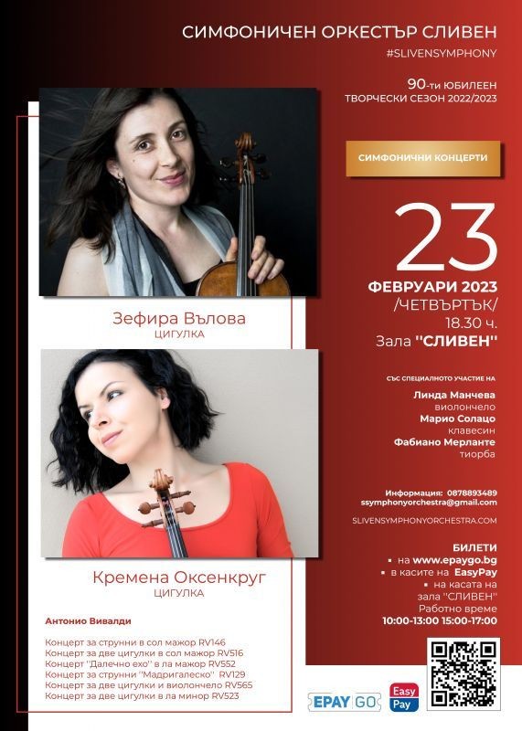 В четвъртък 23 февруари, от 18.30ч. в зала “Сливен”, ще чуем изключителен бароков концерт с музиката на Антонио Вивалди. Подобен проект, много рядко става достояние на публиката извън столицата. Оригинални инструменти, изпълнители от най-високо световно равнище и великолепна програма, подбрана с вкус и разбиране. Симфоничен Оркестър-Сливен ще има удоволствието да си партнира на сцената с един наистина звезден каст.