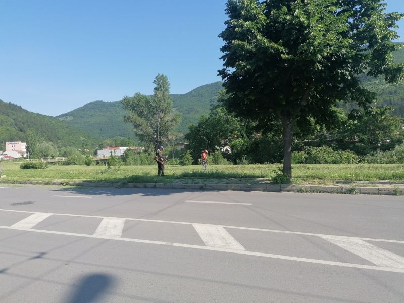 Работните екипи са ангажирани и с косенето на тревните терени на крепостта „Туида“, ДЗС и гробищните паркове, както и с почистването на опасни клони на дърветата.