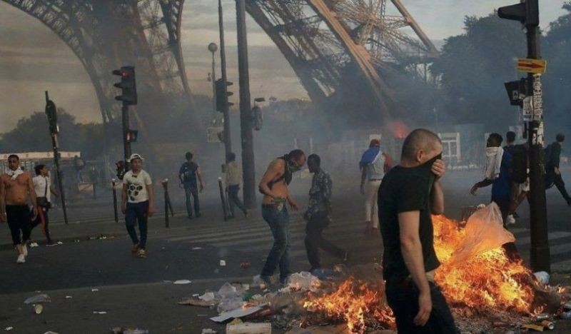 Президентът Емануел Макрон за пореден път опитва да си зарови главата в пясъка, изчаквайки бурята да отмине, без да осъзнава или осъзнавайки, но не знаейки как да спре вълната от насилие, която всъщност е породена не от убийството на малолетния престъпник, а от абсолютната анархия, която от години цари сред неконтролируемите малцинства и имигранти. Снимките, показващи опожарените улици, автомобили, магазини, фотографиите на въоръжени чернокожи младежи, напомнят апокалиптична картина между враждуващи племена в някоя африканска страна, а не картина от европейска държава.